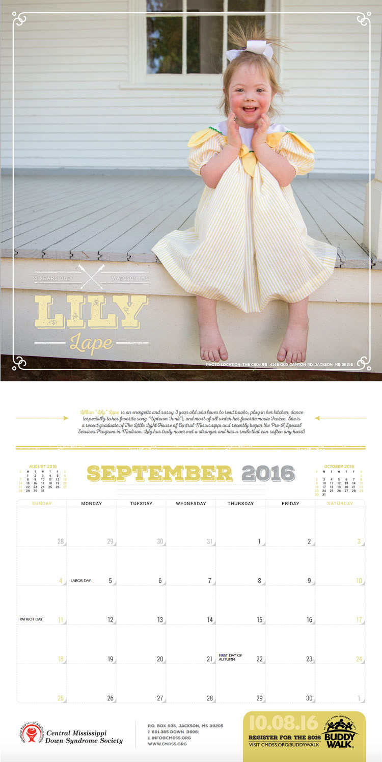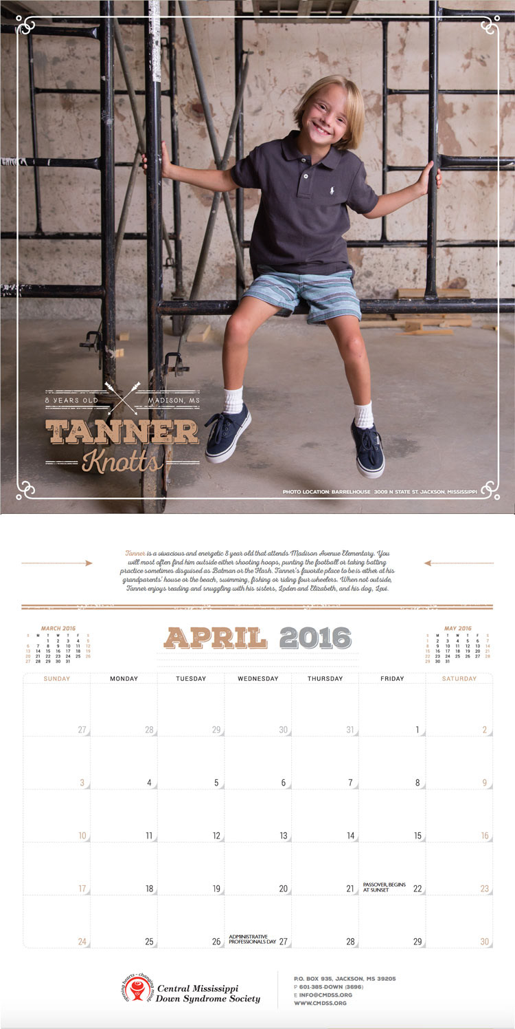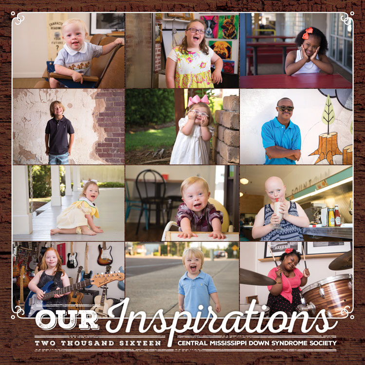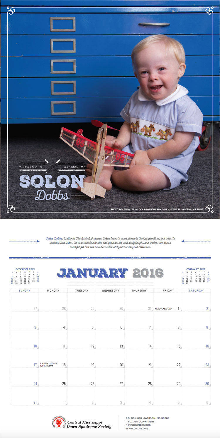 Layout and design for 2016 Central Mississippi Down Syndrome Society Calendar that features a different individual with Down syndrome from the community for each month as well as a short write-up for each.