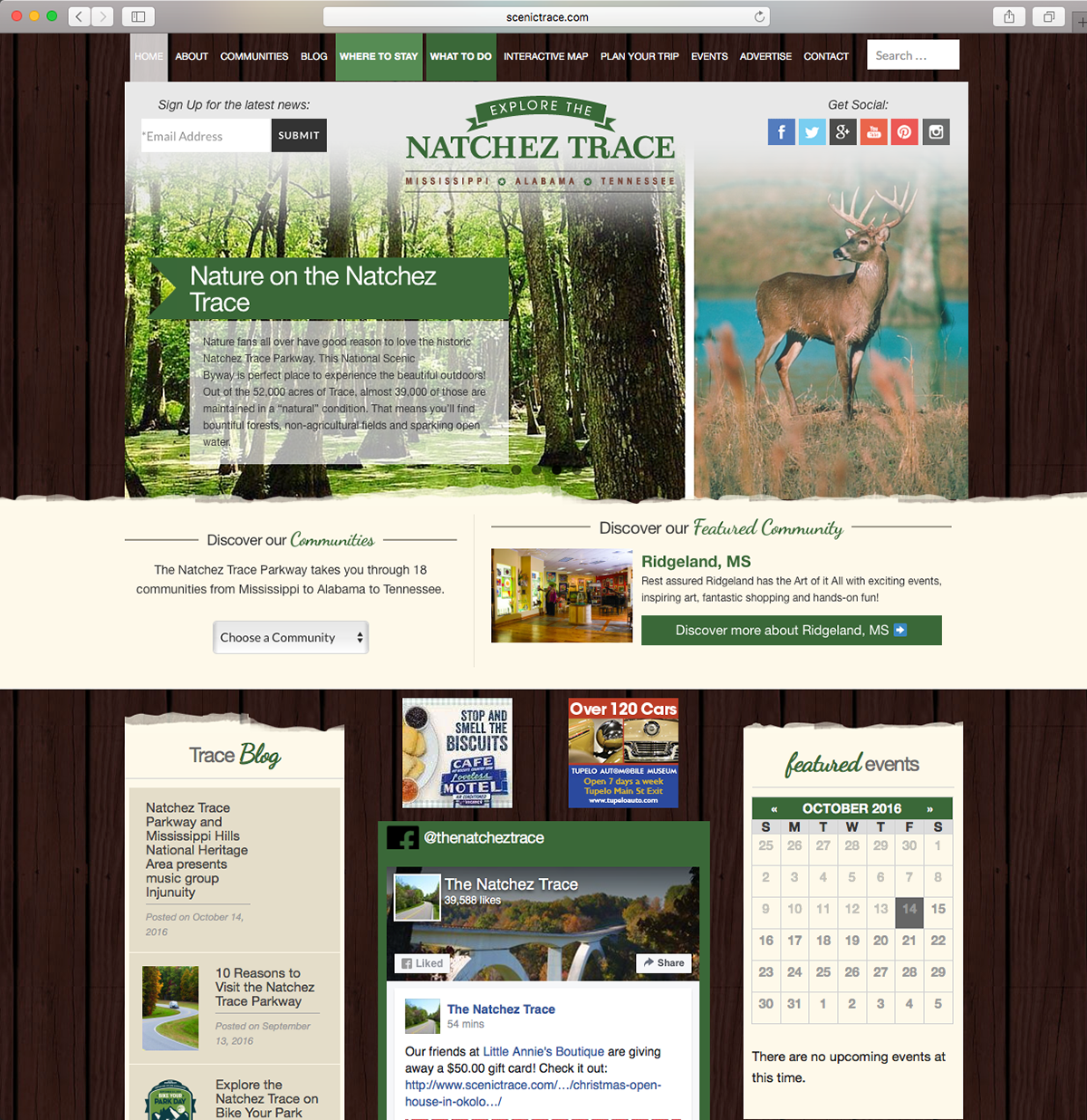 Website redesign + responsive coding for the Natchez Trace Compact. Redesign focuses on communities featured, blog and incorporating advertising